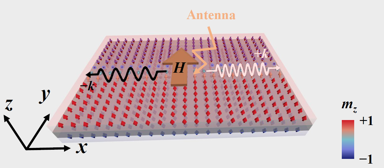 自旋波是磁有序系统的集体激发,因不受焦耳热限制和可以携带角动量等优势,在信息存储和处理方面具有巨大应用潜力。最近研究表明,手性材料中的自旋波传播具有内在的非互易特性,即相反方向自旋波传输存在不对称性。前人研究揭示了静磁表面自旋波在薄膜表面传播的非互易性,Dzyaloshinskii–Moriya相互作用(DMI)可以引发磁子的非互易传播。这类对称性破缺现象为操控自旋波信息传输提供了新的机遇,但同时,非互易效应对固有手性的强依赖也给可编程自旋波器件的设计带来了严峻挑战。因此,探寻有效和便捷调控自旋波传播非互易性的新手段对实验和器件设计至关重要。